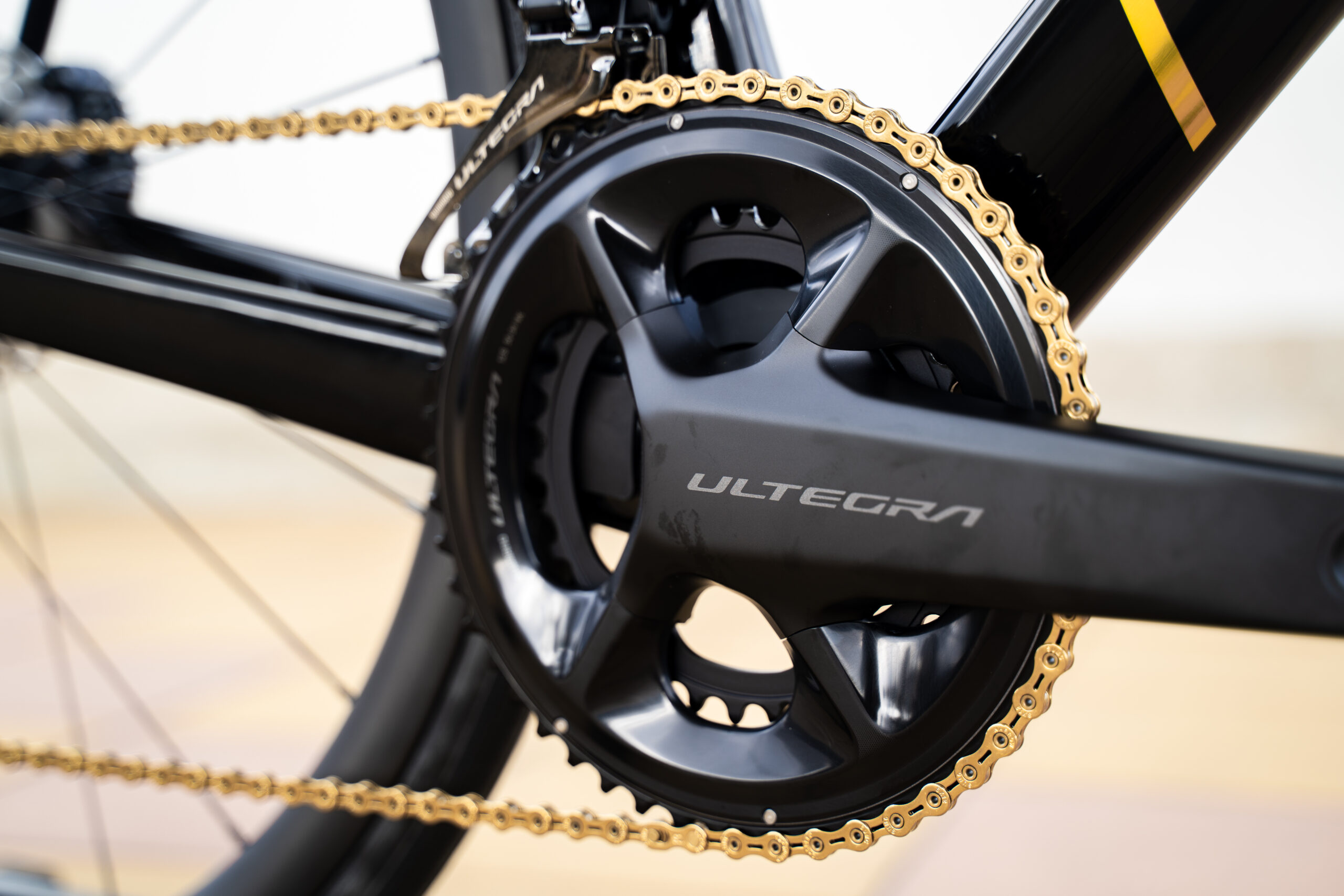 パフォーマンスに優れるULTEGRAのグループセットに、チェーンはフレームロゴに合わせたSUMCのゴールドチェーンでアクセントを加えています。