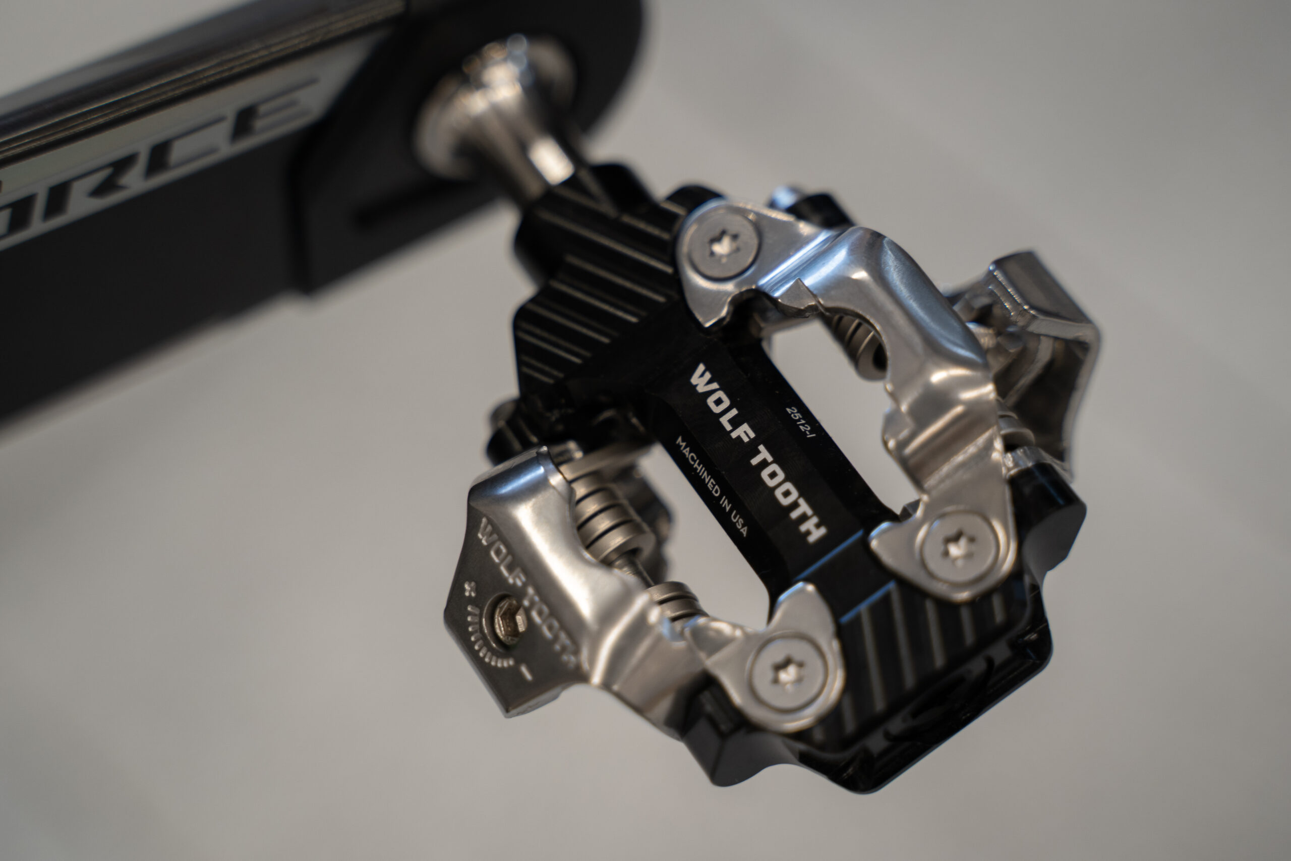 ペダルはWolf ToothのALT。従来のSPDペダルより踏み面が広く効率的にパワーを伝えてくれます。簡単な作業でQファクターを調整できるのも魅力的です。クリートはシマノSPD互換