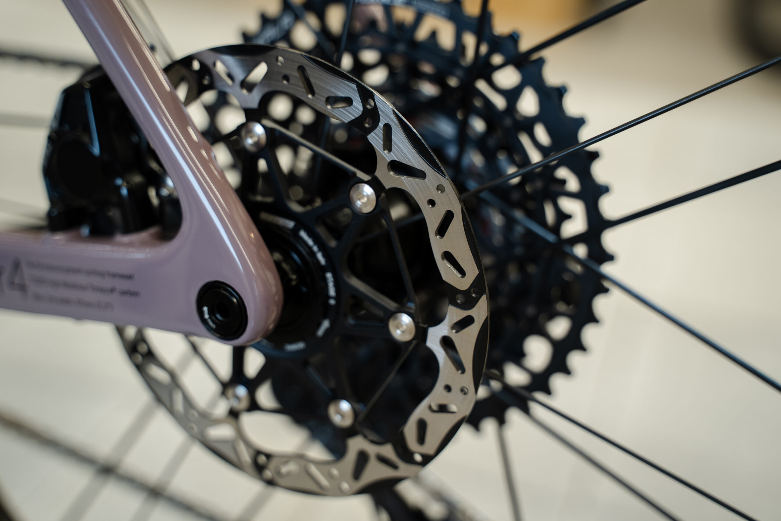 ブレーキローターはBRAKINGのStage 0という珍しい選択。シルバーと黒色部分に設けられた段差でブレーキダストや泥、水などを自動的に排除してくれるため、常にブレーキ面がクリーンに保たれ、音鳴りなどが起きにくい構造が特徴です。加えてコントロール性と制動力にも優れるため、ブレーキへの意識が最小限で済みます。