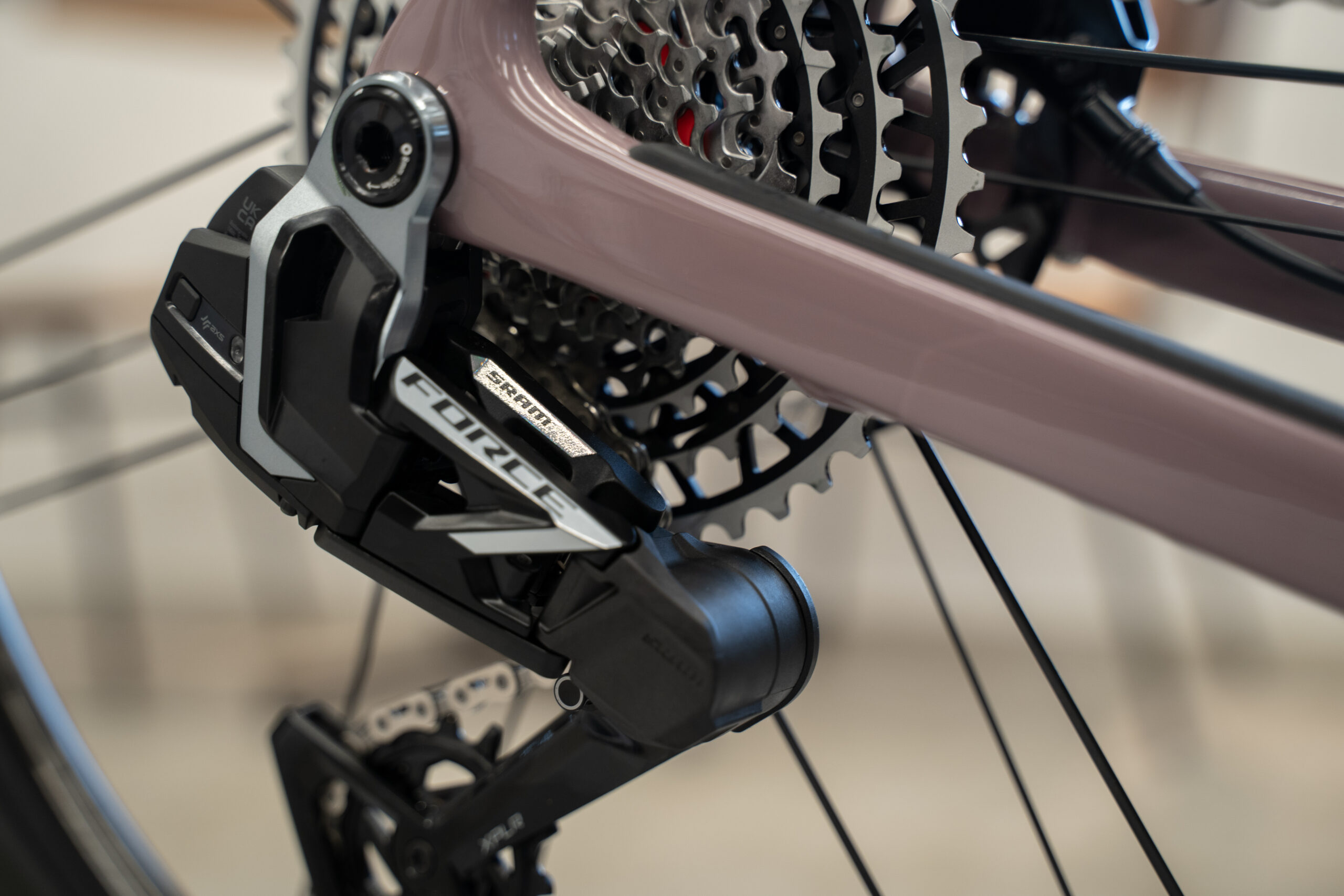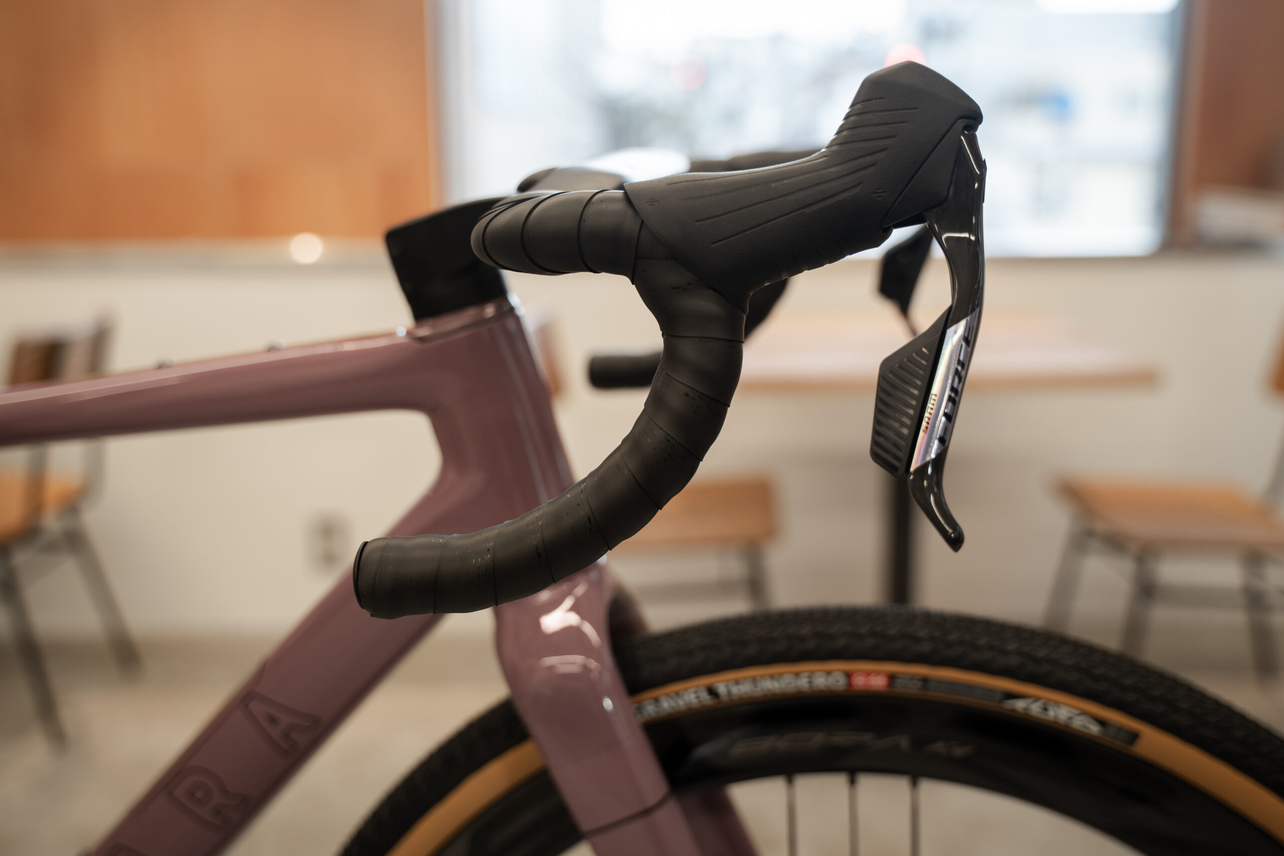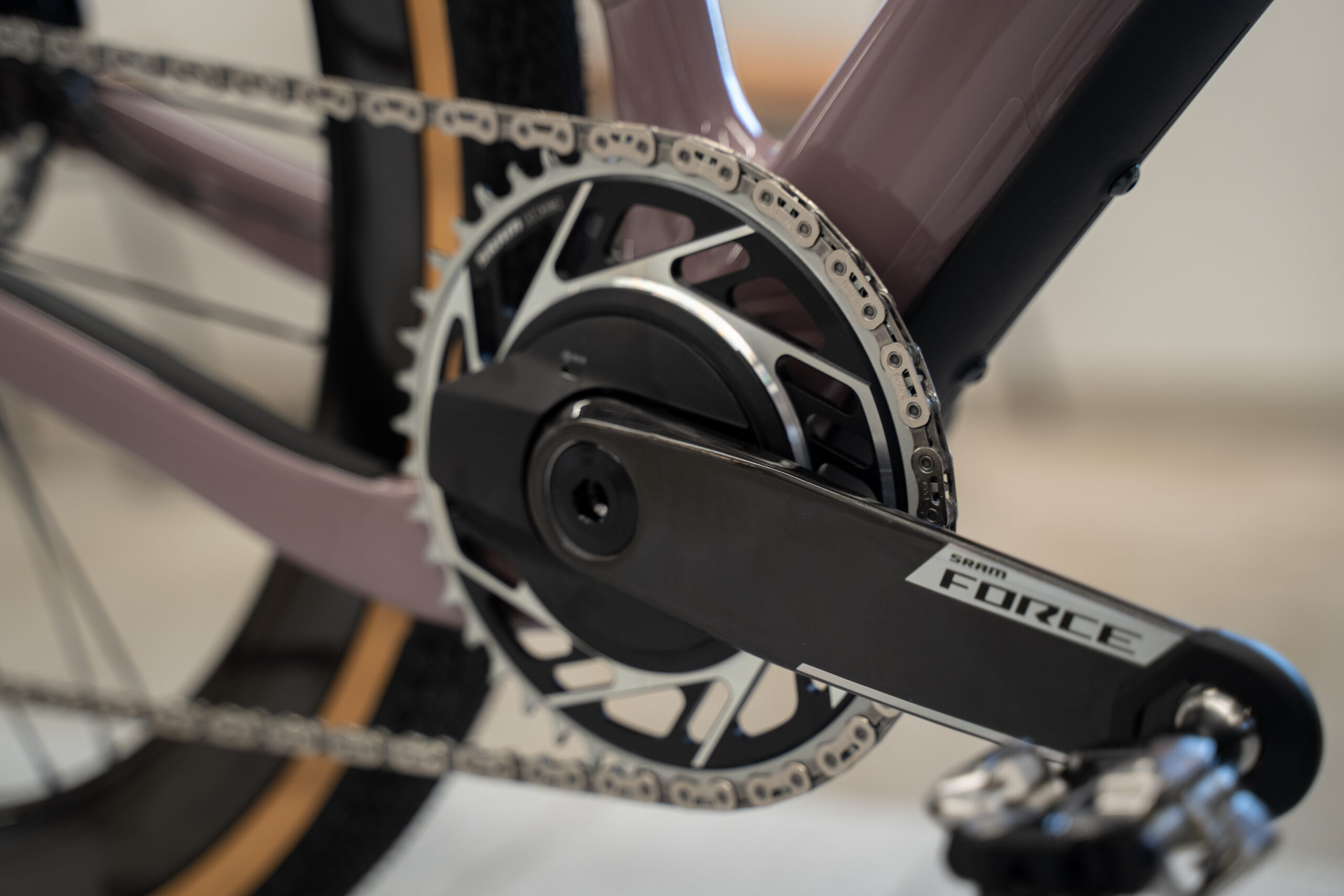 グループセットはSRAMのグラベル用グループセットForce XPLR。転倒や異物の巻き込みに強く、13速の10-46Tカセットは幅広い状況に対応します。
