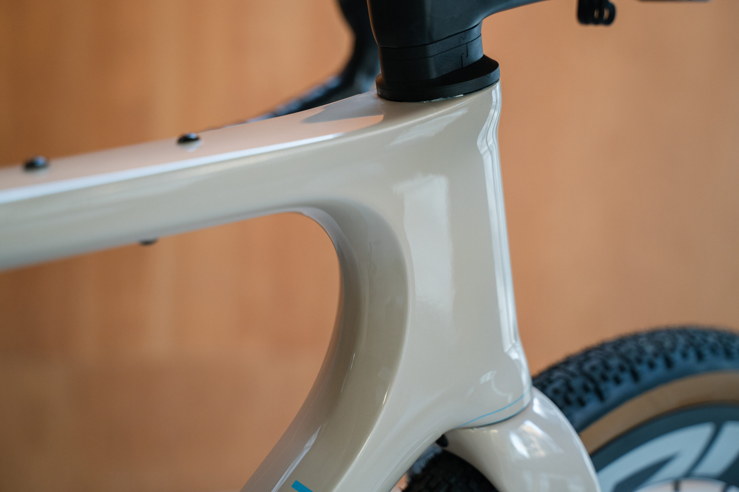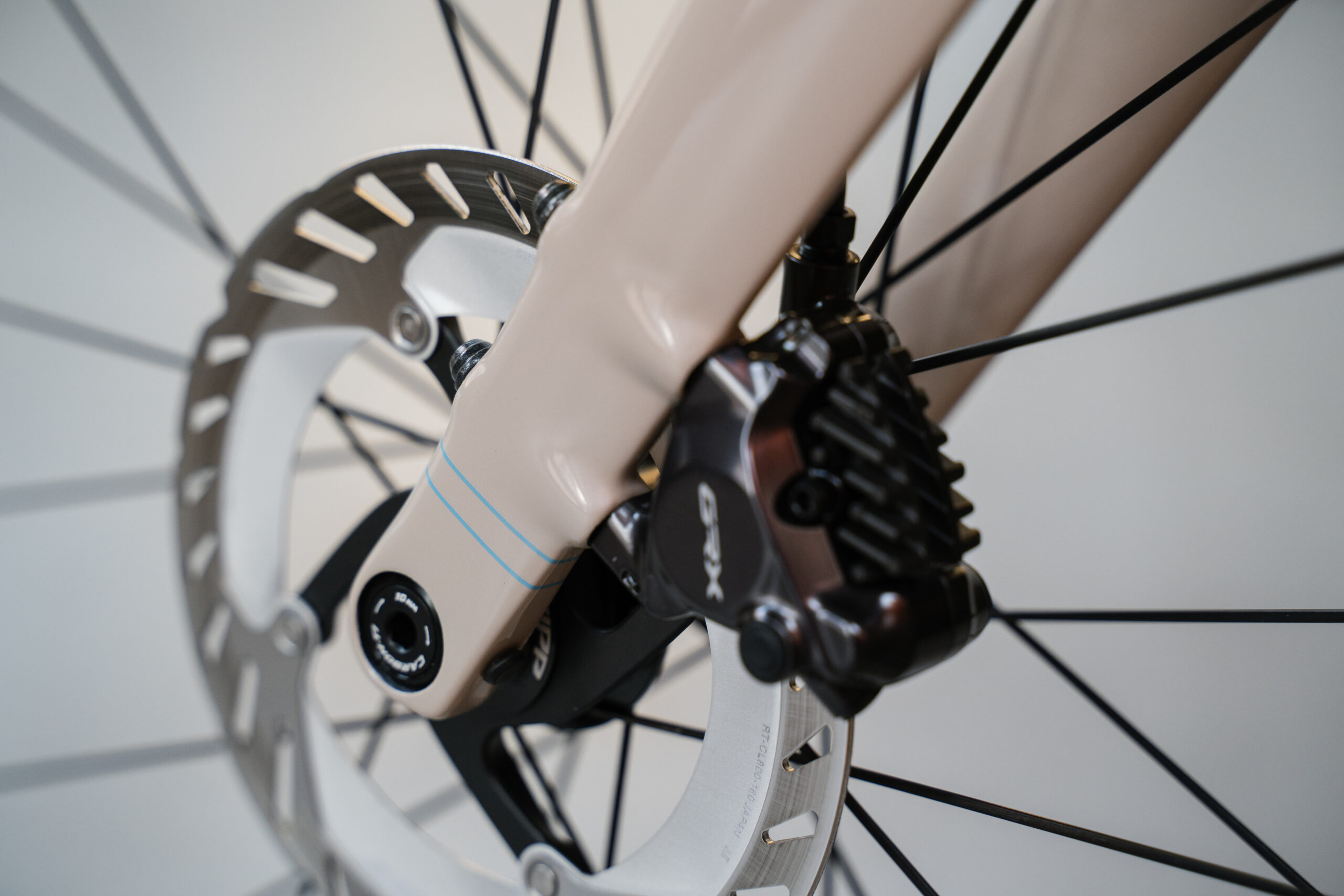 まずはオリジナルペイントを施したフレーム。ラインナップにはない柔らかいアースカラーにブルーのラインが個性的です。