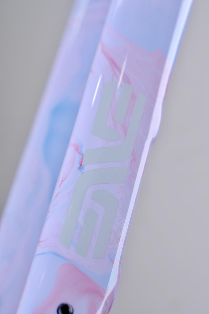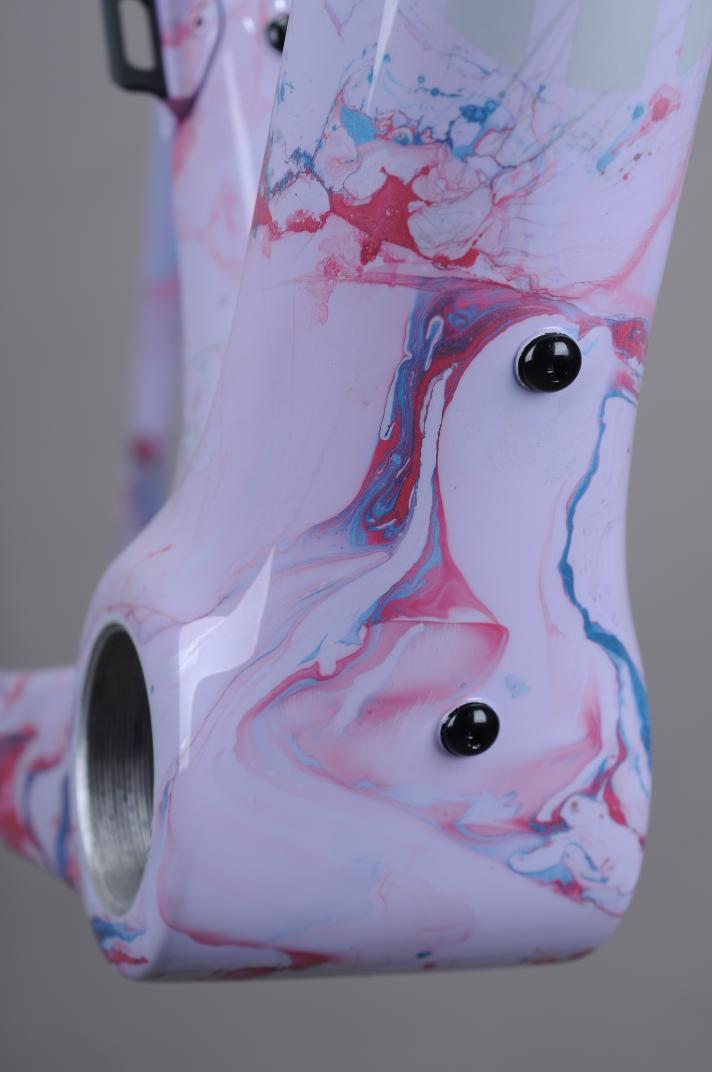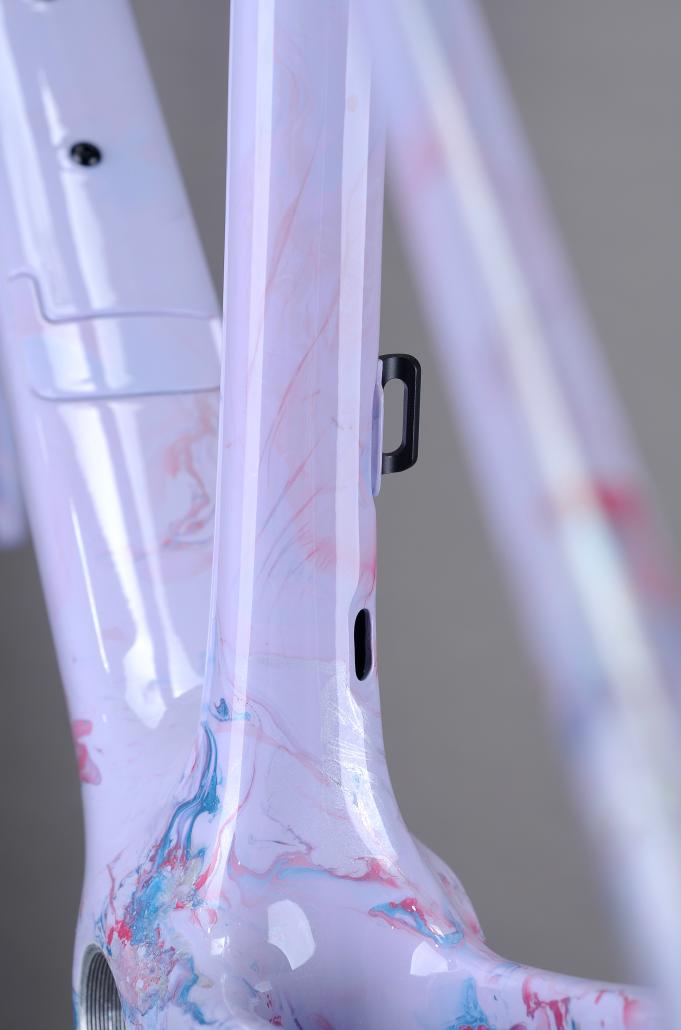 完成したフレームにはラベンダーを基調とした落ち着いた佇まいの中に、水圧転写による不規則なマーブル模様がアクセントとして加えられています。