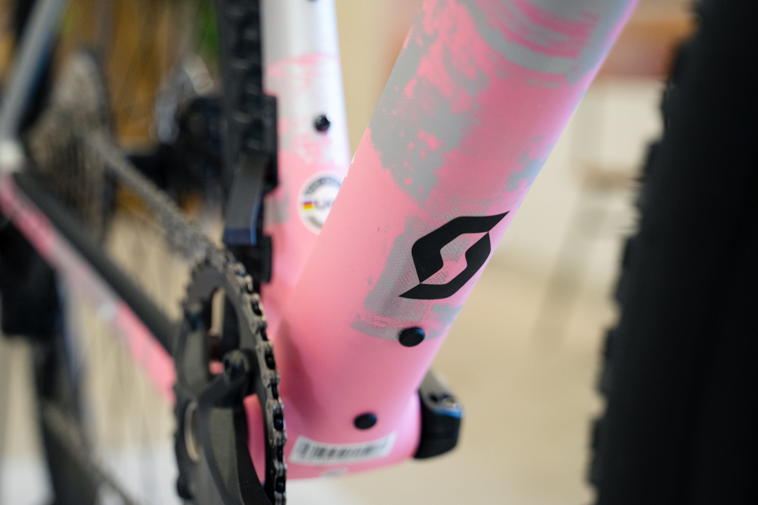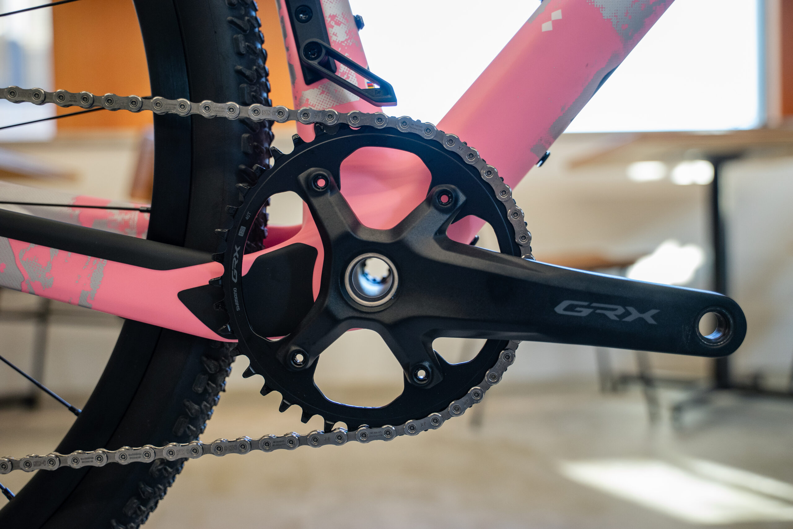 フレームは電動変速だけでなく機械式変速にも対応。Shimano GRXのフロントシングル仕様に専用のチェーンウォッチャーが装着されています。ウォッチャーを外せば、代わりにFD台座を取付てフロントダブルに換装することも可能です。